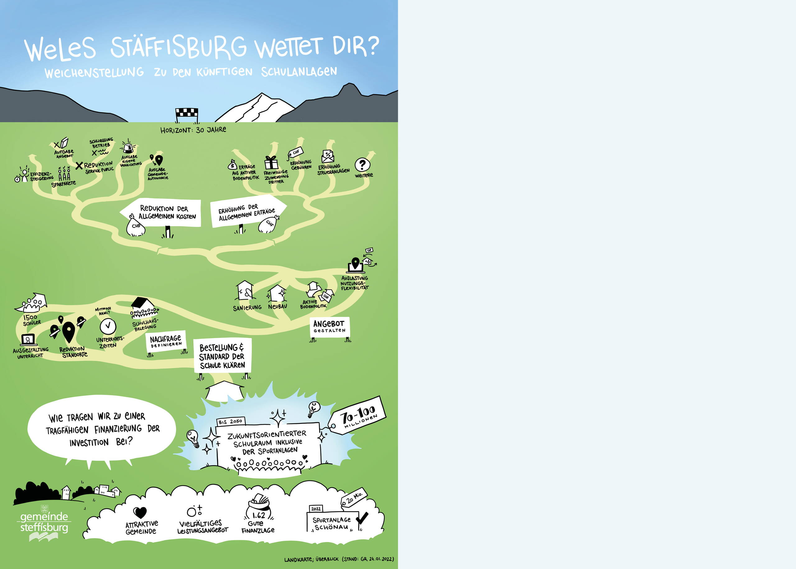 Die Strategie und der Handlungsbedarf der einzelnen Liegenschaften wurden in einem ganzheitlichen Massnahmenplan zusammengetragen. Entscheidend in der langjährigen und komplexen Planung ist, die Politik und Bevölkerung abzuholen. Dafür wurde eine «Landkarte» mit allen wichtigen Meilensteinen und Zielen gestaltet.