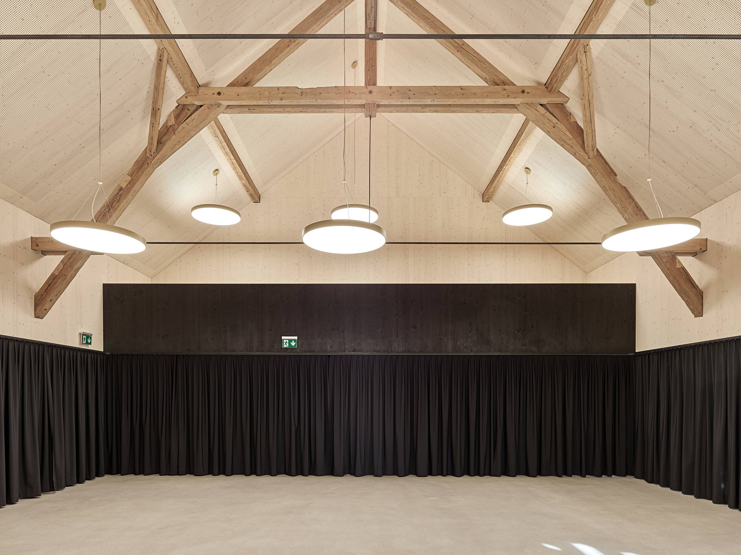 Die bestehende Struktur wurde so weit möglich erhalten, restauriert und mit neuen Bauteilen ergänzt. Ausreichend Tageslicht, der Schallschutz und die Raumakustik waren wesentliche Rahmenbedingungen. Passend zur bestehenden Gebäudestruktur wurde der ehemalige Stall in Massivbauweise und die ehemalige Heubühne in Holzbauweise erstellt. Das Materialkonzept ist schlicht und der Nutzung entsprechend gestaltet. Regionale Baustoffe, insbesondere bei der Holzkonstruktion, kamen zur Anwendung.